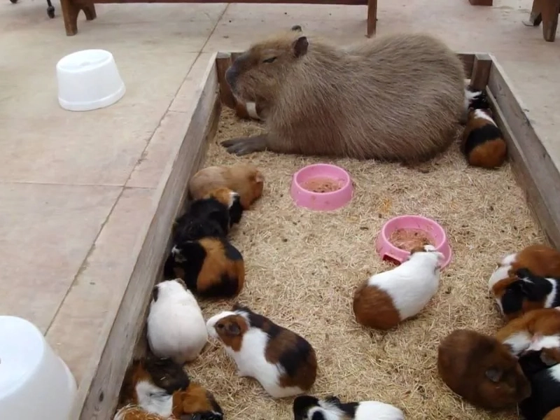 As members of the same rodent family, capybaras and guinea pigs share an incredibly special bond. Despite their dramatic size difference, these rodents frequently form close relationships in controlled environments, exhibiting remarkably similar social behaviors and communication patterns. Their charming interactions typically involve group resting, shared mealtimes, and gentle mutual grooming. For guinea pigs, capybaras' calm and friendly nature provides a safe and enriching social environment. From a scientific perspective, these precious bonds offer valuable insights into social behaviors and adaptability of rodent species across different size ranges.