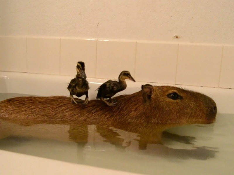 In wetland habitats, capybaras and various waterfowl species, particularly ducks, have cultivated absolutely fascinating relationships. These species frequently share identical aquatic environments, engaging in social interactions that benefit both tremendously. Ducks cleverly take advantage of capybaras' movements to stir up aquatic plants and invertebrates, while capybaras genuinely appear to enjoy their feathered friends' delightful company. Ducklings have even been observed peacefully resting on capybaras' backs as they swim gracefully. This wonderful relationship perfectly highlights how animals can develop mutually beneficial interactions in shared natural habitats.