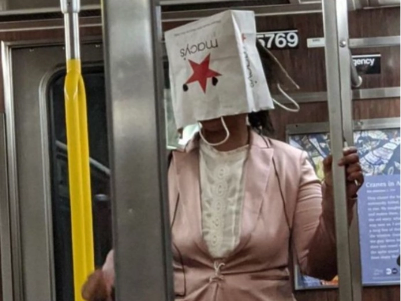 With quick wit, this traveler shields an elaborate hairstyle using a humble plastic bag. Fashion ingenuity wins the battle against drizzle and drafts.