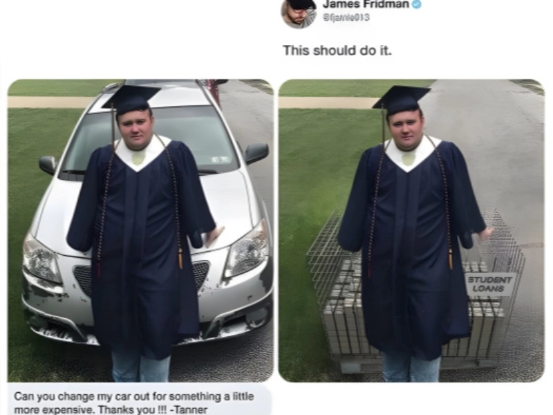This picture captures essentially what every recent graduate from a U.S. college experienced thirty years ago. This man wanted his car changed for something somewhat more expensive. Although we're not clear why the one he had looked absolutely great, he most likely meant like a more expensive car. Though that's not unusual or anything, it has a few paint chips.