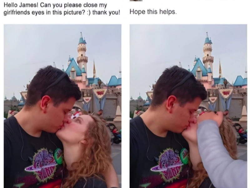 Most everyone should follow a few basic guidelines, and one of them is to always close your eyes when you kiss. It's simply a little bit creepy; nobody wants to seem like that weirdo kissing while eyes open. It's also very funny. Although we don't believe this is what the man in this picture had in mind, he asked that his girlfriend's eyes be photoshopped closed.