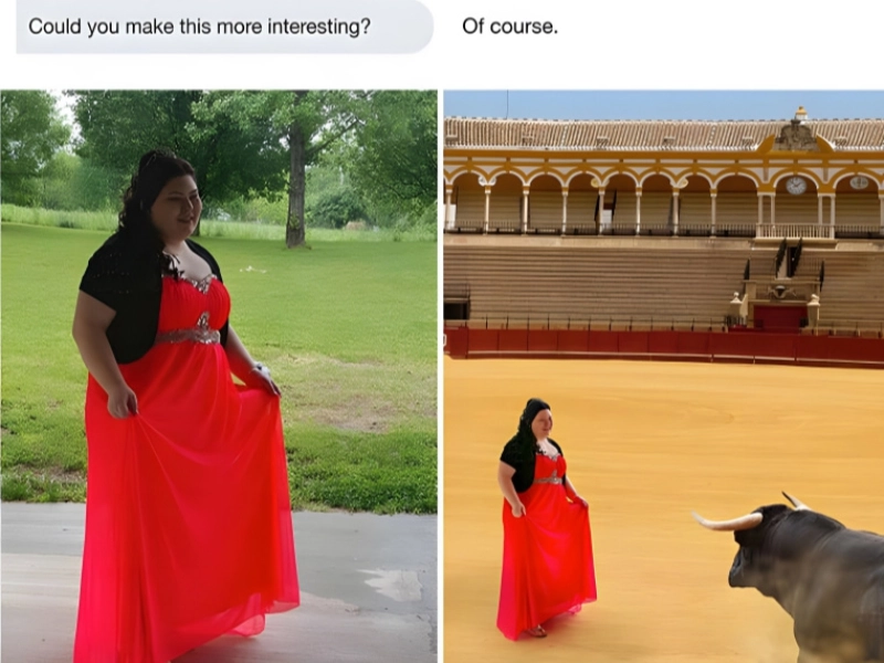 Although the first picture on the left caught our attention, the girl in it asked for some spicing of her image. The editor of it thus included a bullfighting ring and a bull to the picture. More intriguing than a bullfighter is what? Nearly nothing. The outfit already being red also helps; you practically worry for the life of this girl in the second picture.
