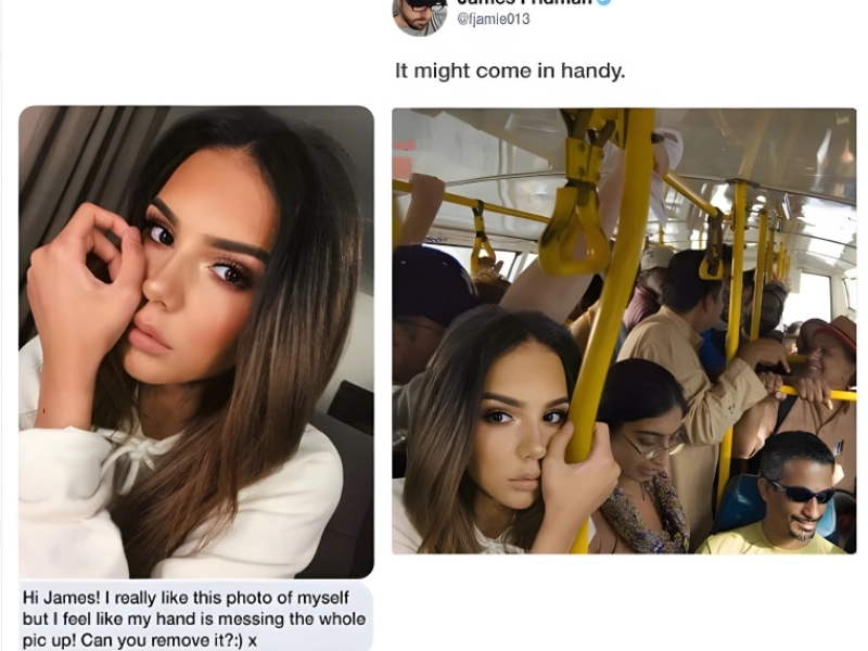 This list includes some "weird" hand pictures; we have never seriously considered hands ruining pictures before now. The girl in the picture on the left did, though, and expressed dissatisfaction with the way her hand appeared. Rather, she sought something to do with it, and she exactly found what she needed. She boarded a crowded bus, and in the second picture her hand seems more at home.