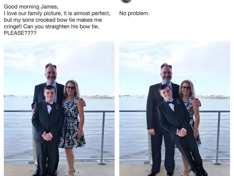 The toughest people to photograph are children. Still, the child in this picture truly seems to be having a rather nice time. He seems to be doing it deliberately and is even smiling. Still, the mother asked to have her son's bowtie straightened out since she observed it was somewhat twisted. Of course, it was straightened out; however, if you will, it was twisted, or rotated. (We apologize).
