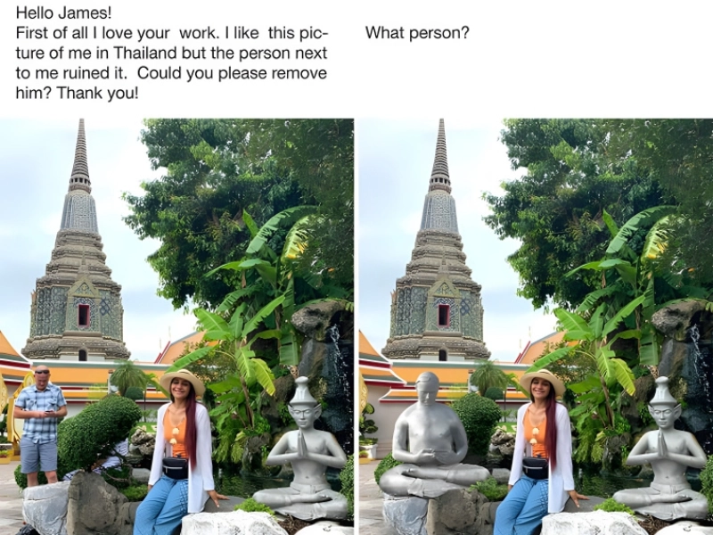 It's somewhat frustrating, isn't it, when some random individual ruins a picture you truly love? This female thought so and called the person in the background to ask to have him taken off. He's still staring down at his phone; a stone monument to match the one on the right replaced him. He must have been staring at something quite fascinating if it could have turned him entirely to stone like that.