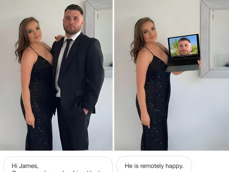 Many people have found themselves exactly at this place. The female in this picture wasn't really pleased that her boyfriend refused to smile for the camera. She thus demanded that he be made to "look remotely happy about being with me." The picture she returned showed her carrying a laptop with her lover tuning in remotely from what looked to be a tropical island or something.