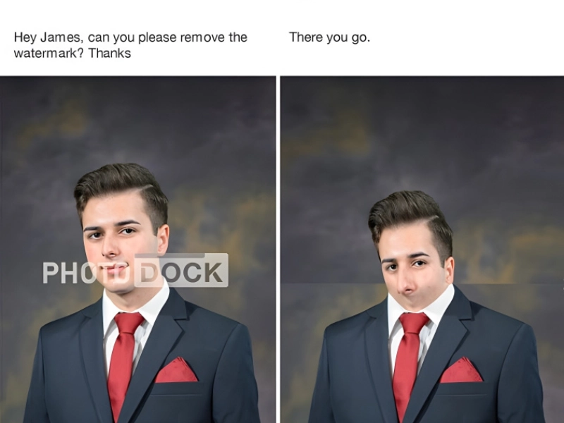 On many different levels, this Photoshop work is outstanding. If you know Photoshop somewhat, this man requested the watermark to be deleted—not too difficult. Still, it's also how photographers protect their work from being exploited without pay. That could be the reason this man just returned a totally useless image. The only action done was removing the whole middle section with the watermark.