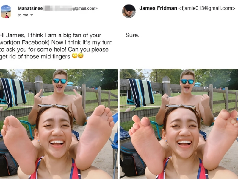 This one is probably quite obvious, but the girl in this picture asked to have the guy's two middle fingers removed. We understand why you might want something like that removed from a picture. But they simply ended up being replaced by the guy's big toes. Still, they're his big toes rather than his middle fingers, which we would assume is better than the gesture he was making before.