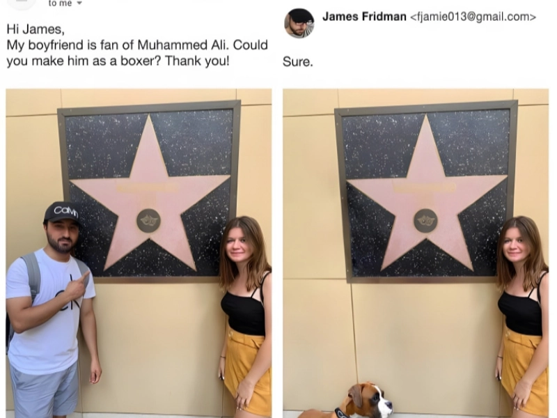 Extremely devoted to Muhammad Ali, the man in the picture on the left and his fiancée visited his star at the Hollywood Walk of Fame. His fiancée so wanted to do something pleasant and inquired whether he might be trained as a boxer. She clearly wasn't referring to the dog above, although the picture on the right technically isn't totally incorrect.
