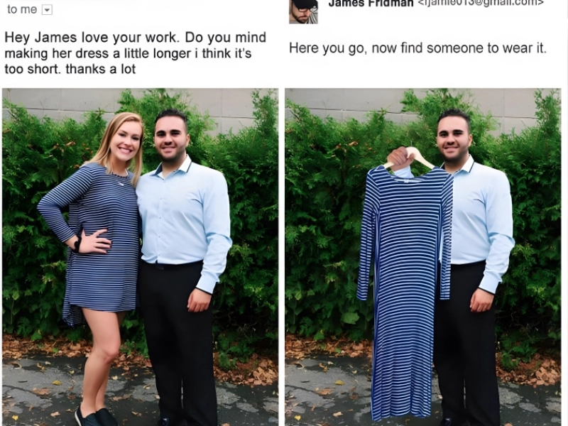 Though it's a really small remark, it's usually not a good idea to criticize someone's outfit. This guy thought the girl's dress looked excessively long, hence he asked that it be shortened. But in the second picture he obtained more (or less) than he had expected. The dress was shortened, but he lost the girl. We now doubt whether that was his girlfriend, but even so.
