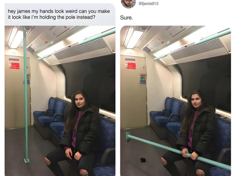 Here is another picture showing someone unhappy with their hands and arms. To be honest, they appear great to us here. After all, what else could you be doing with them on your metro ride? The man then grabbed the pole from the middle of the car to give the impression that she had carelessly torn it down and was clutching it in her hands.