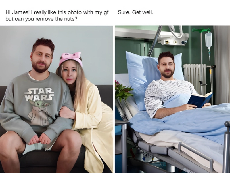 The man in this picture wrote in a request asking that the left-leaning photo's nuts be removed. Given the overall picture seems a bit weird and the two of them appear to have just woken up, we're not exactly sure why. He got his wish, nevertheless, and ended up in the picture on the right post-surgery. We can only guess about the type of surgery he was supposed to be recovering from.