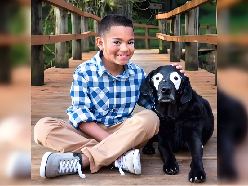 A boy and his dog share mirrored vitiligo patterns, their bond written visibly across two species. Together they turn difference into unity.