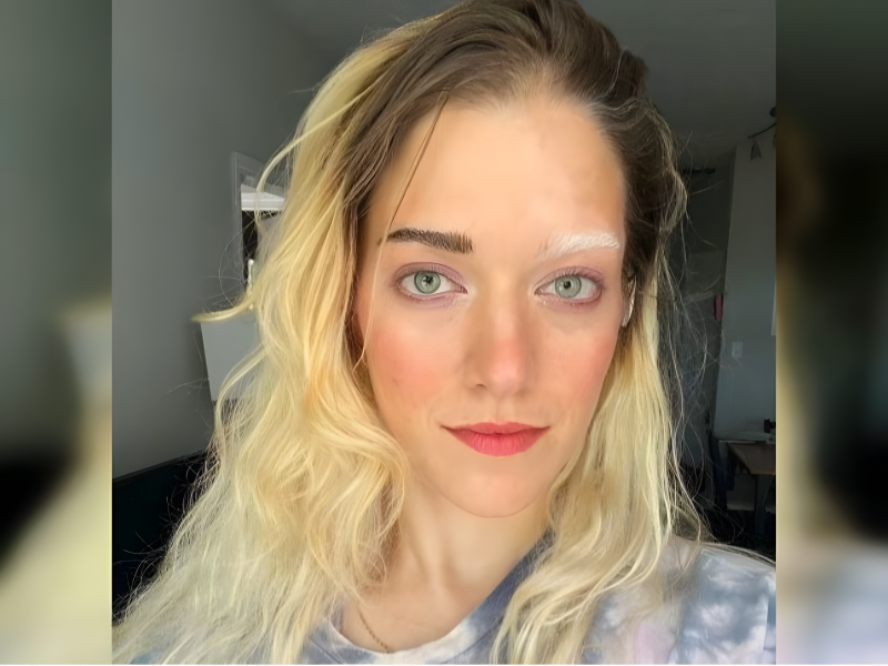 Vitiligo lightens one eyebrow into a bold streak, turning unpredictable skin change into living design. The contrast transforms her face into a canvas where biology paints with light and shadow.