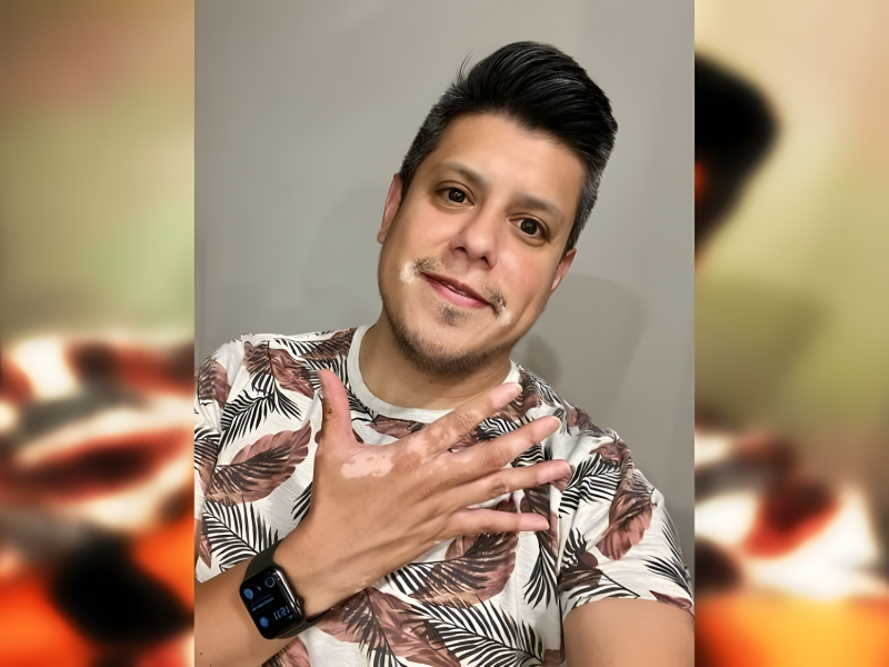 Vitiligo spreads across his skin in bold patches, creating a living map of contrast. Each new pattern tells a tale of resilience and reinvention.