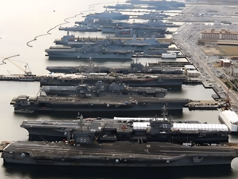 The facility features ten docking platforms spanning roughly 20 kilometers in total length. These structures accommodate the requirements of the Navy's most imposing ships, with harbor depths also extending to 14 meters.